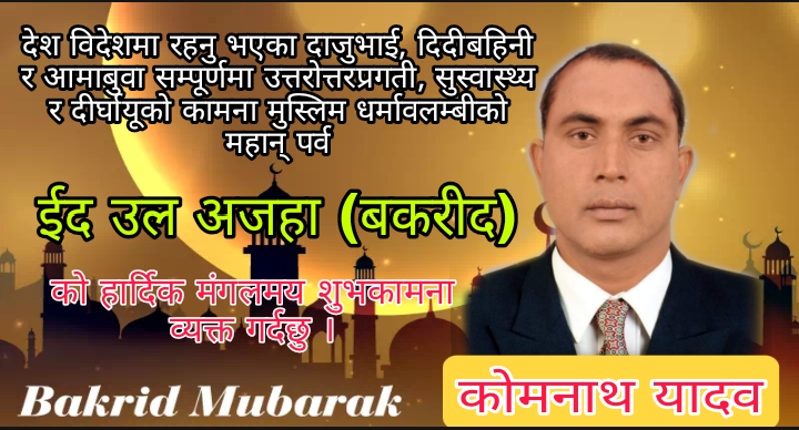 ने.क.पा. माओवादी केन्द्र जिल्ला कमिटी सदस्यतथा शुद्धोधन गाउपालिका सचिव कोमनाथ यादव युवा नेता समाजसेवी भने,”आउदै गरेका मुस्लिम धर्मावलम्बीहरुको महान् पर्व बकरा ईद को उपलक्ष्यमा स्वदेश तथा विदेशमा रहनुभएका सम्पूर्ण नेपाली, दाजुभाई दिदी बहिनी, राष्ट्रियप्रेमी, उद्योगी, व्यापारी, समाजसेवी लगायत सम्पूर्ण देशवासीहरुमा सु-स्वास्थ्य, दीर्घयु तथा उत्तरोत्तर प्रगतिको हार्दिक मंगलमय शुभकामना व्यक्त गर्दछु ।”